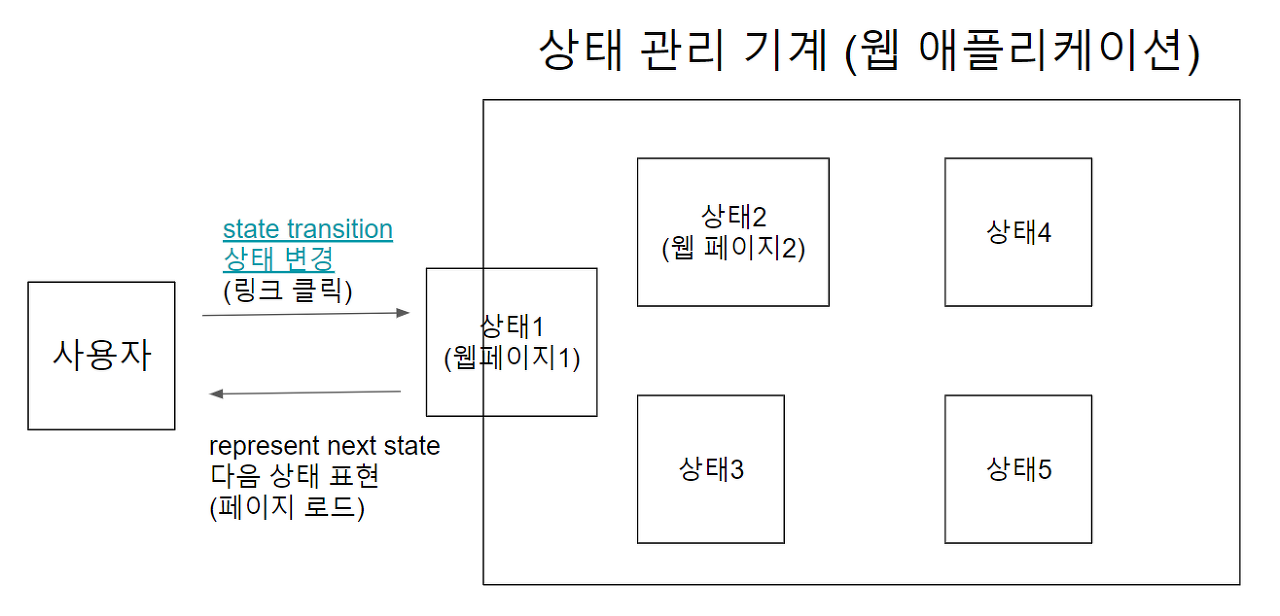 REST API의 창시자인 로이 필딩(Roy Thomas Fielding) 박사는 웹 애플리케이션을 가상의 상태 관리 기계(virtual state-machine)로 보았다고 합니다. 이 기계의 상태는 사용자가 링크를 클릭함으로써 바뀌게 되는 거죠.